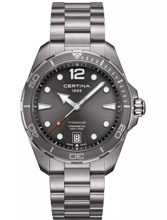 Certina DS Action Diver C0324514408700 fremviser en dykkerstil med en titaniumrem, der tilføjer holdbarhed, mens den forbliver let. Den grå urskive og bezel, parret med en sølvfarvet urkasse, skaber et raffineret og sammenhængende udseende. Brugen af safirglas til urglasset sikrer klarhed og ridsemodstand, hvilket bevarer urets pletfri udseende over tid.
