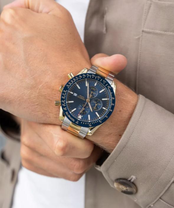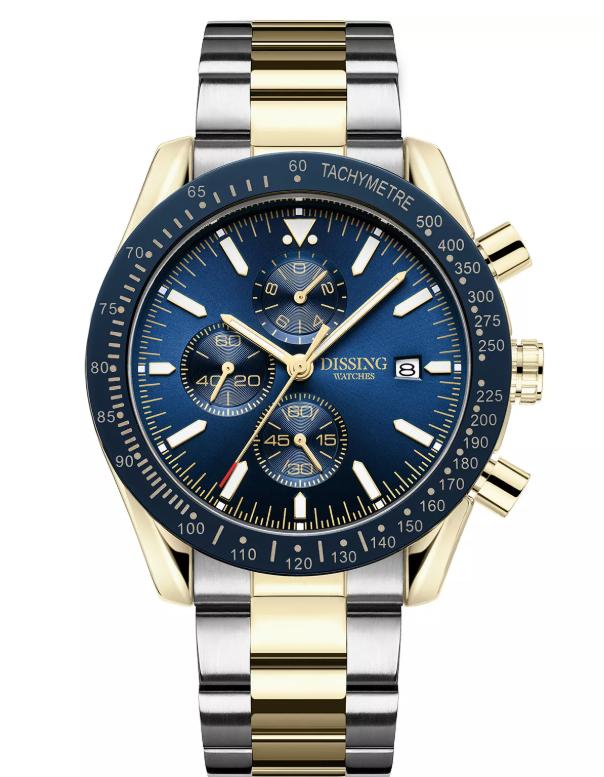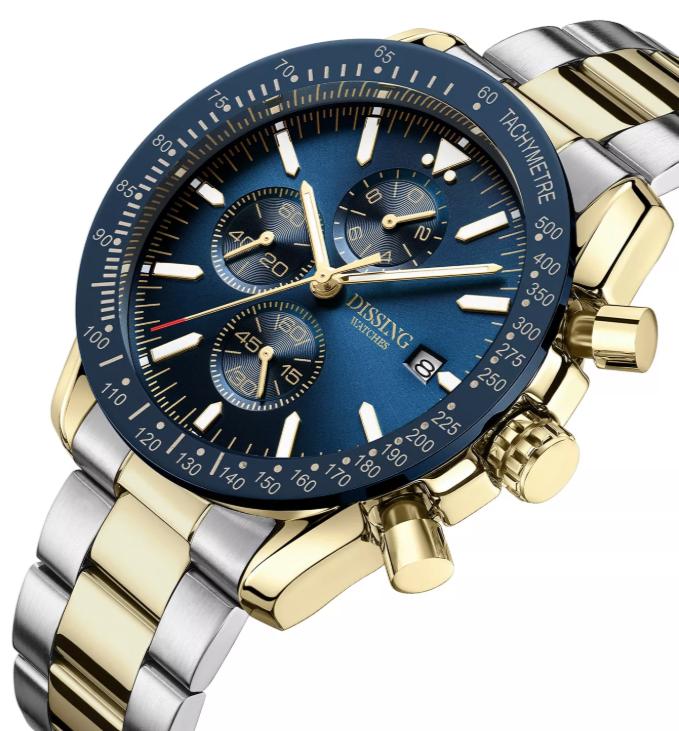 Dissing Chrono D1272 er et imponerende ur, der skiller sig ud med sit slående design og funktionelle egenskaber. Med en diameter på 44 mm gør dette ur et kraftfuldt indtryk på håndleddet. Den runde urkasse har en glat urskive, der er suppleret med tre kronografer, hvilket tilføjer dybde til designet. Bezelen er detaljeret med indeks, hvilket fremhæver dets dynamiske udseende. Uret er parret med en to-tone lænke, der veksler mellem to kontrasterende nuancer og skaber et iøjnefaldende mønster.