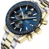 Urens stil fremhæves yderligere af dets farveskema. Det har en blå urskive, der harmonerer med den blå bezel, mens den gyldne urkasse tilføjer et strejf af elegance. Stål-lænken i guld og sølv er sikret med en foldelås for en behagelig pasform. Dette kronograf ur er udstyret med et kvarts urværk og tilbyder praktiske funktioner som datovisning og tachymeter. Med en vandtæthed på 5 ATM er det velegnet til daglig brug. Lumen sikrer, at viserne er synlige i svagt lys, hvilket gør det både stilfuldt og funktionelt.