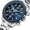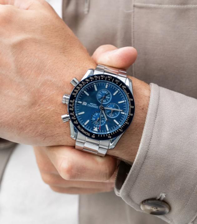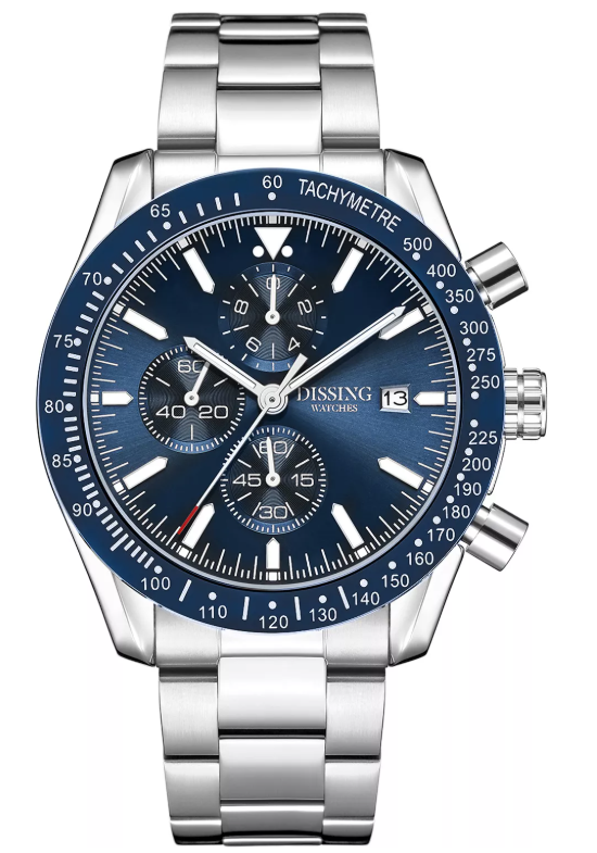 Dette ur, en del af Dissing Chrono-kollektionen, er designet med en diameter på 44 mm, hvilket gør et stærkt indtryk på håndleddet. Uret er udstyret med et kvarts urværk og inkluderer datovisning og tachymeterfunktion. Vandtætheden er vurderet til 5 ATM, hvilket er velegnet til daglig brug. Uret er forbedret med Luminova, der sikrer synlighed i svagt lys. Den rustfri stål-lænke supplerer den sølvfarvede urkasse og den blå urskive, med en matchende blå bezel. En foldelås giver sikker brug, og det safirbelagte mineralglas tilføjer holdbarhed.