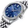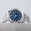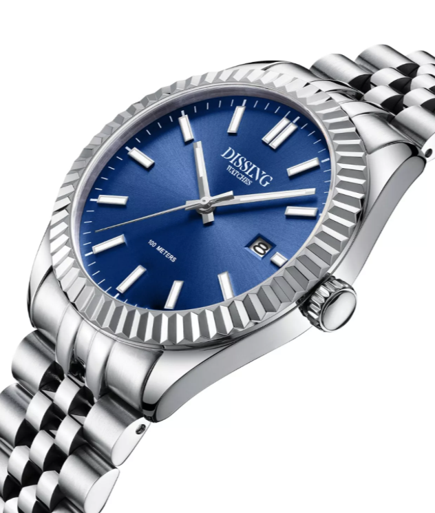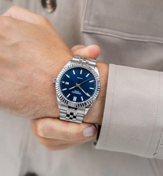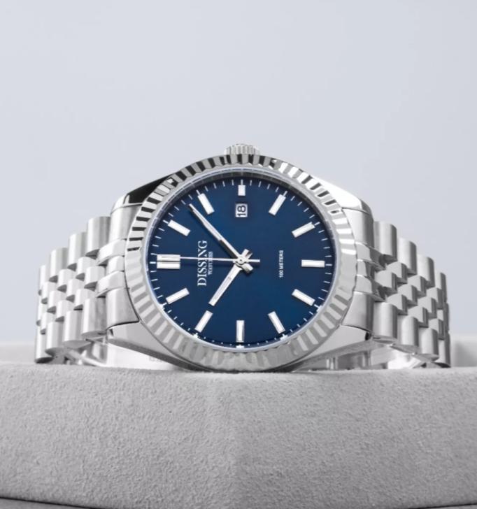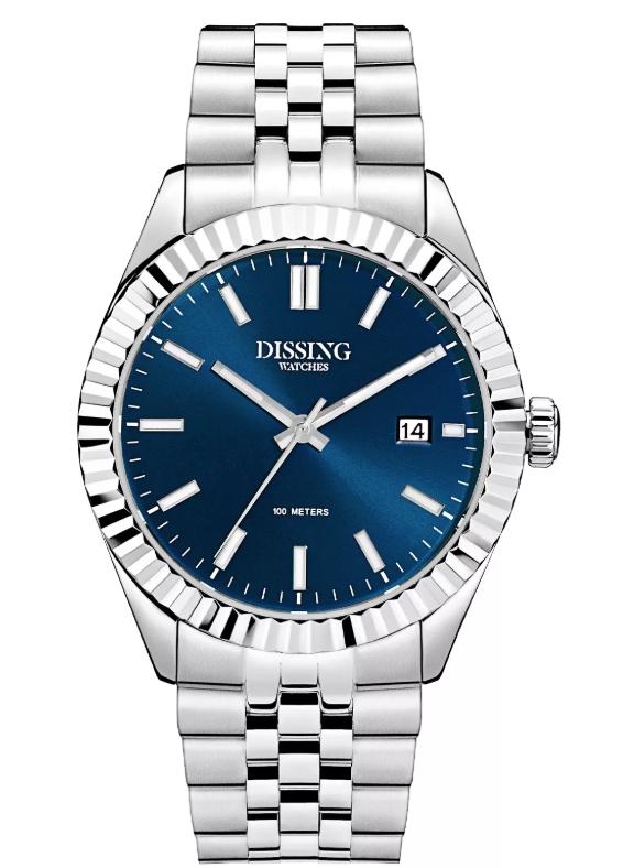 Dissing Date D1320 uret kombinerer en klassisk stil med moderne funktionalitet. Med en diameter på 41 mm gør dette ur et subtilt, men elegant indtryk på håndleddet. Den runde urskive er suppleret af en tekstureret bezel, og de slanke timemarkører tilføjer til dets tidløse design. Urskiven er en imponerende blå, mens både urkassen og bezelen er sølvfarvede, hvilket skaber et harmonisk look. Det rustfri stålarmbånd med ledsegmenter integrerer sig naturligt med den sølvfarvede urkasse, hvilket giver et klassisk og tidløst udseende.