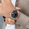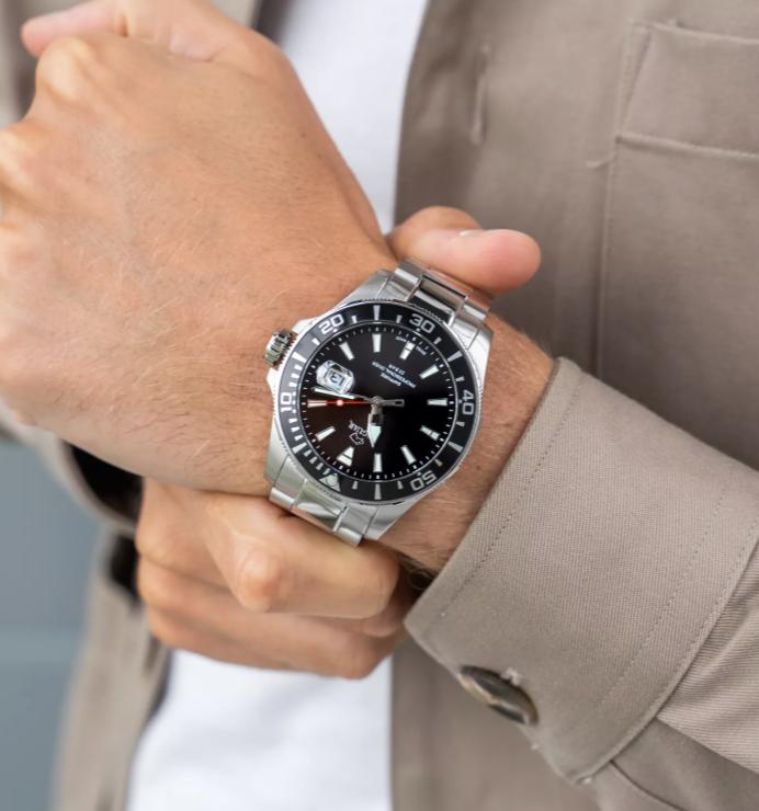 Med en diameter på 44 mm gør dette ur et stærkt indtryk på håndleddet. Uret er udstyret med kvarts urværk drevet af Ronda 6003D kaliber, og dets robuste 20 ATM vandtæthed gør det velegnet til dykning. Swiss Made mærket sikrer høj kvalitet. Uret inkluderer også Super-LumiNova lumen for synlighed i svagt lys og leveres med en ekstra rem for alsidighed. Foldelåsen sikrer en sikker pasform, mens safirglas beskytter urskiven, alt sammen indkapslet i holdbart 316L kirurgisk stål.