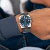 Det klassiske design af Tissot PRX er tydeligt i dens stållænke, der komplementerer den sølvfarvede urkasse og bezel. Den blå urskive tilføjer et strejf af farve, der skaber en sofistikeret kontrast, der er både tidløs og alsidig. Urets design forbedres yderligere af den strømlinede lænke, der integreres med urkassen, hvilket skaber et sammenhængende look, der er både stilfuldt og funktionelt.